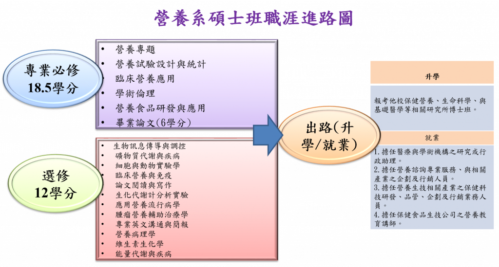 就業:本碩士班畢業生可至:(1)學術研究機構、研發單位、行銷/顧問公司 (2)營養品/食品保健/醫藥生技公司 (3)醫院營養部門/門診/醫美中心 (4)長照、養護機構、社區機構 (5)藥局、婦嬰用品、藥妝事業機構 (6)寵物營養品/食品保健公司或專賣店 (7)有機/生機/農場機構 (8)學校/衛生單位、營養專業政府單位 (9)飯店、團膳(盒餐)、食品公司研發中心 (10)基金會/保險/健康事業單位/慈善機構就業