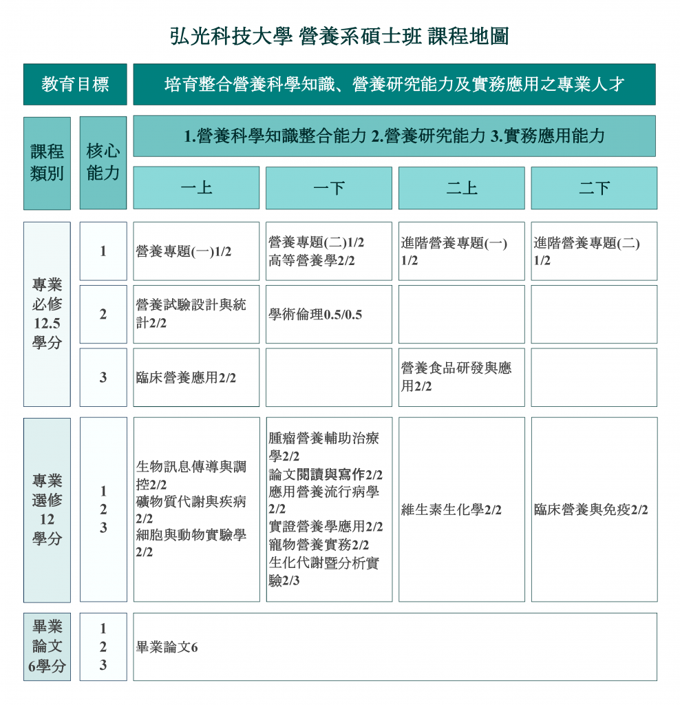 整合基礎營養科學知識,結合實務應用課程,訓練學生從事營養與保健及疾病基礎或臨床研究。以營養科學知識整合能力、營養研究能力、實務應用能力三大核心能力規劃課程,建立學生具備學理涵養、實驗設計與分析及實務操作等多元實務知能,強化學生回到職場,或進入職場的競爭力。